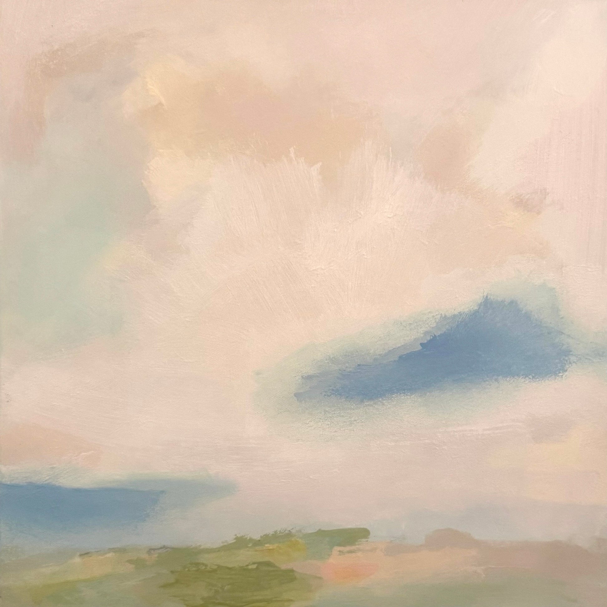 A gentle landscape that drifts between earth and sky, painted in soft layers of peach, blush, and misty blue. Wisps of cloud and horizon blend into a luminous haze, evoking the quiet beauty of light moving across an open sky. This piece is soothing yet full of life, perfect for bringing calm energy into a space.
