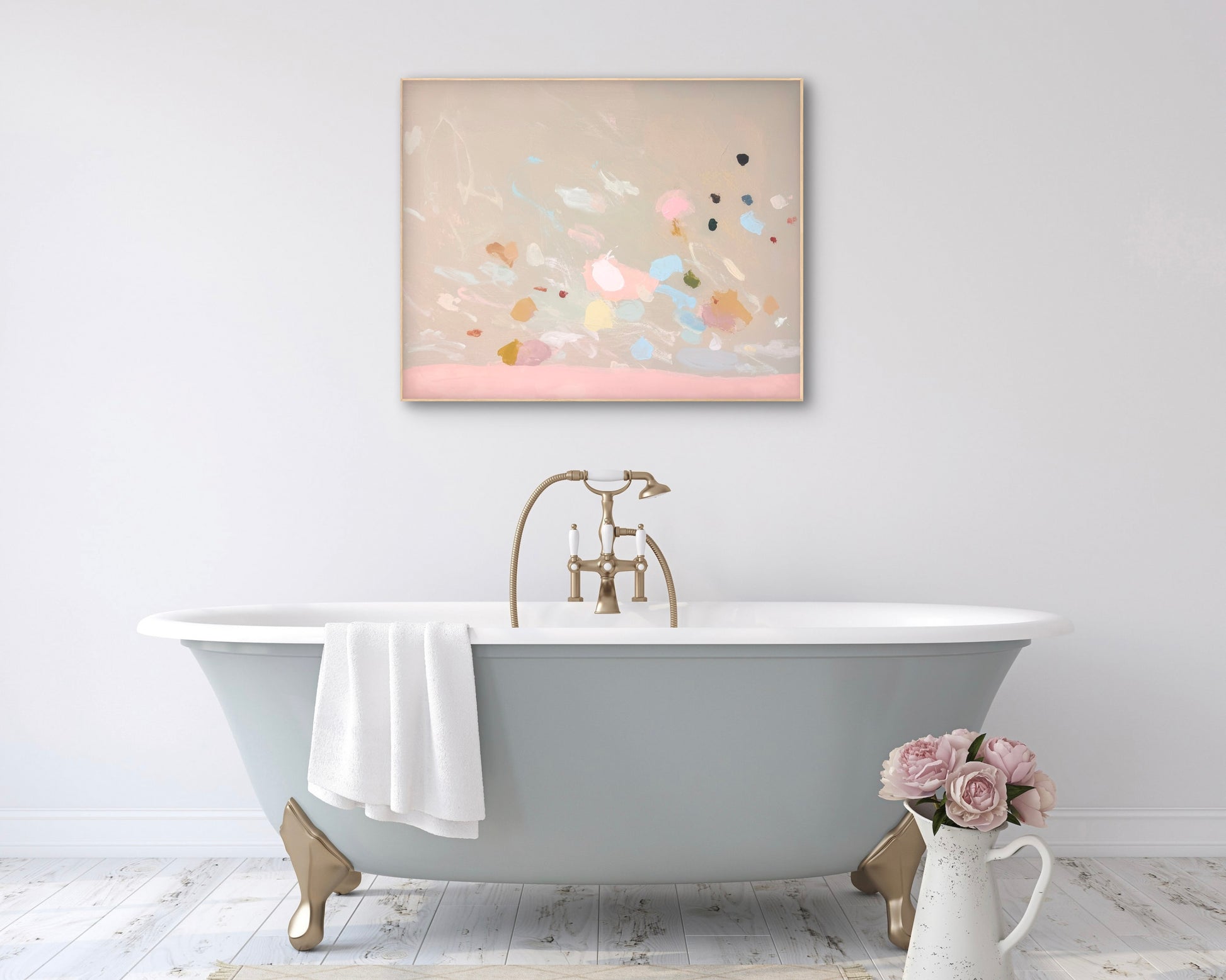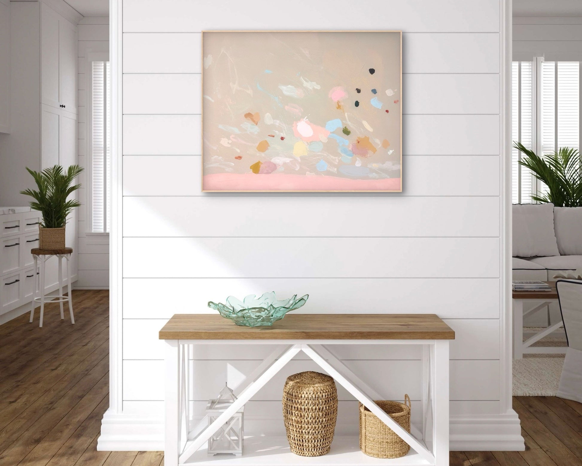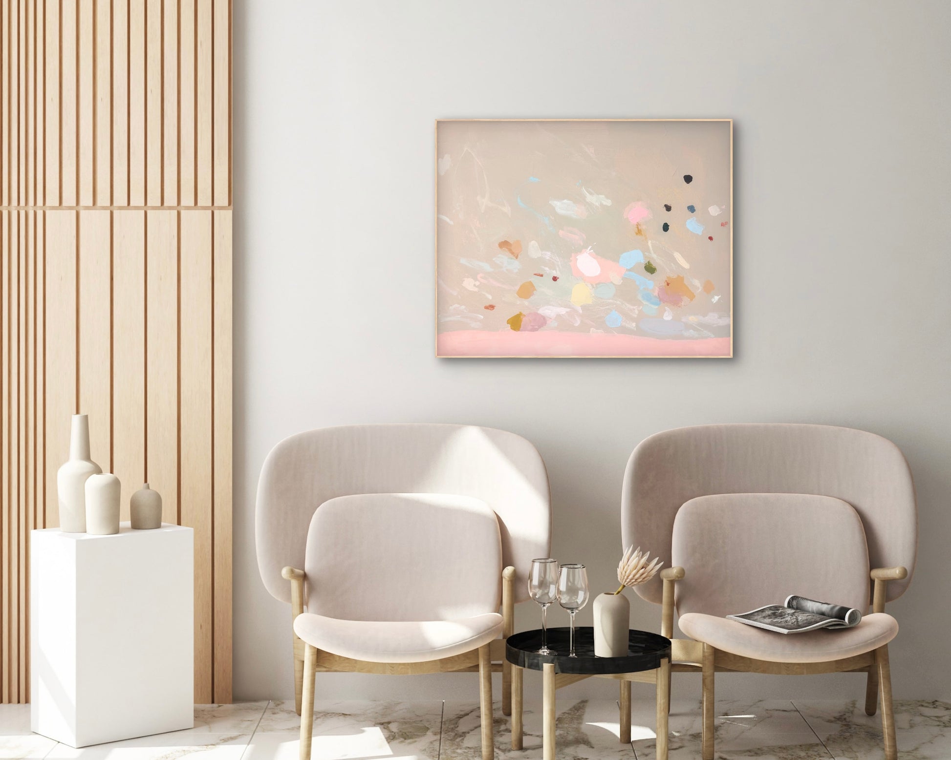 Soft blushes, misty blues, and playful marks drift across a serene backdrop, blending Rothko-inspired expanses with Twombly-like gestures. A calming yet lively piece from my French-inspired collection, celebrating color, movement, and nature. Rainbow snowfall on pink coastal sands. A playful and poetic representation of nature.