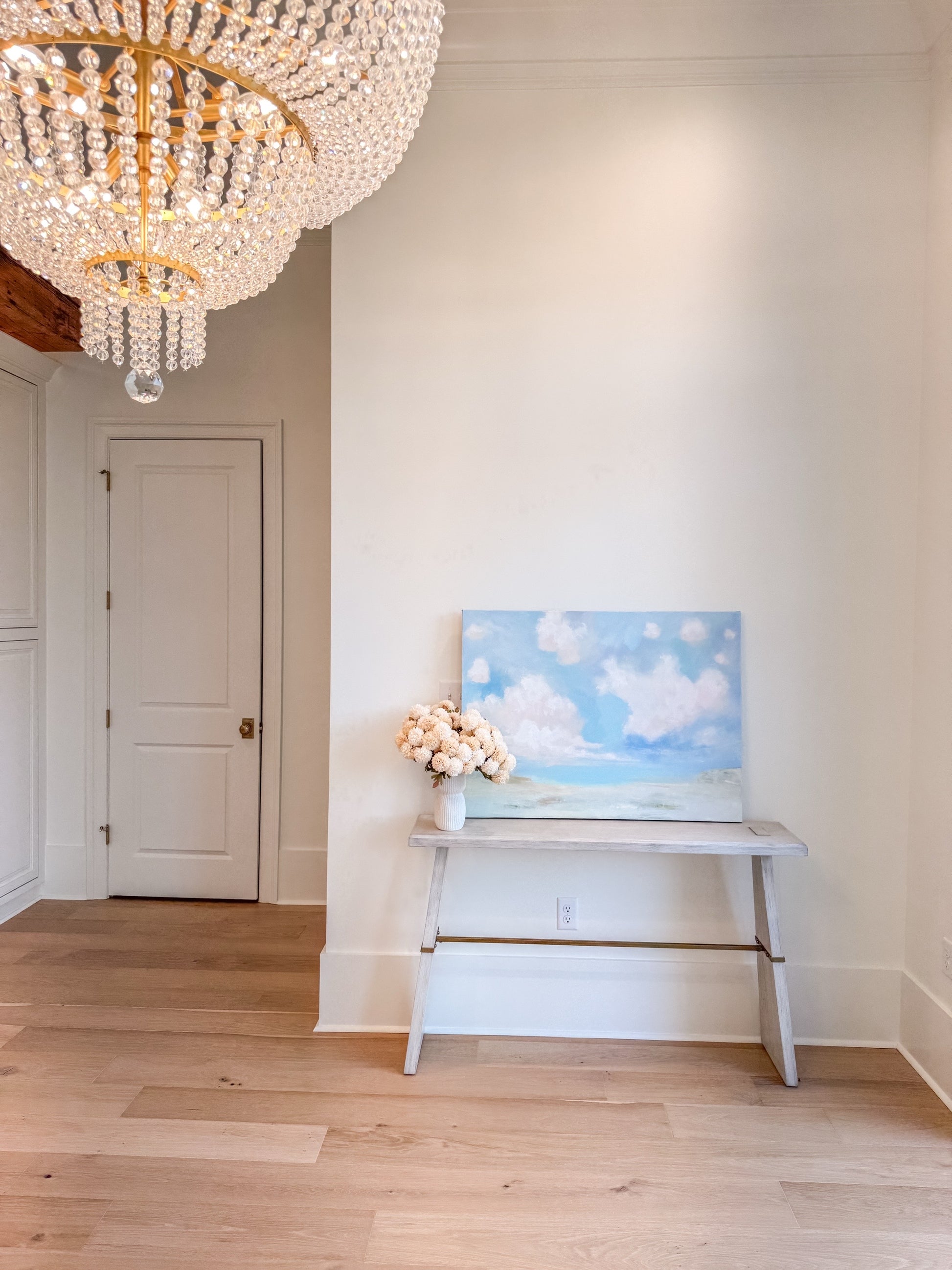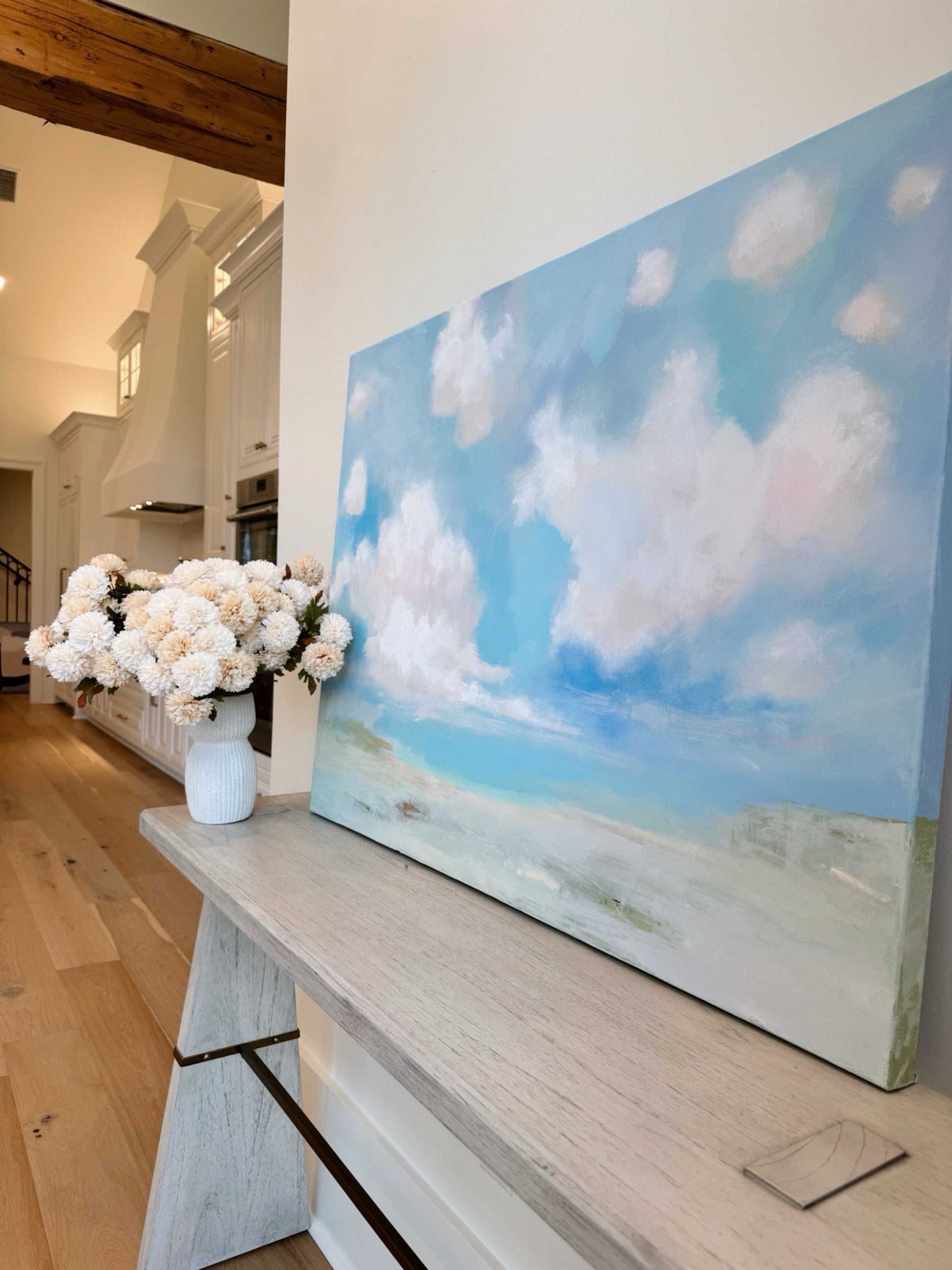 Painted in soft layers of sky blue, blush, and warm white, this piece captures the quiet beauty of drifting above the clouds. Gentle brushwork and airy tones create a serene, coastal mood — perfect for spaces that invite calm and light.
