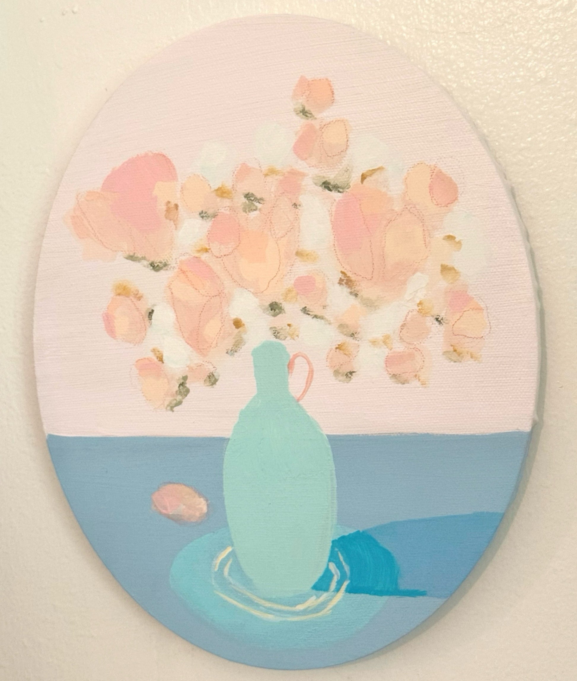 A timeless bouquet captured in the gentle shape of an oval, where soft blooms meet the quiet elegance of shadow. Painted with refined detail and warm, romantic tones, this piece celebrates stillness, beauty, and the simple luxury of flowers in full bloom. Perfect for intimate spaces, it carries the charm of a keepsake — a painting to be treasured for years to come. 8 x 10 acrylic on canvas